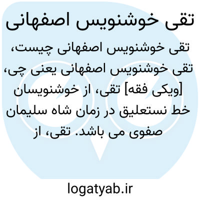 [ویکی فقه] تقی، از خوشنویسان خط نستعلیق در زمان شاه سلیمان صفوی می باشد. تقی، از خوشنویسان خط نستعلیق در زمان شاه سلیمان صفوی بوده بر روی سنگ نوشته ای در یک سقاخانه واقع در مسجد لنبان به خط نستعلیق اشعاری را در سال ۱۱۰۰ق نوشته و در پایان کتیبه «مشقه تقی» رقم زده است. هنرفر، لطف الله، گنجینه آثار تاریخی اصفهان، ص۶۳۰. ۱. ↑ هنرفر، لطف الله، گنجینه آثار تاریخی اصفهان، ص۶۳۰. منبع مهدوی، سیدمصلح الدین، اعلام اصفهان، ج۲، ص۲۰۴. ...