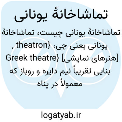 {theatron , Greek theatre} [هنرهای نمایشی] بنایی تقریباً نیم دایره و روباز که معمولاً در پناه تپه یا کوه برای اجرا و تماشای نمایش در یونان باستان می ساختند
