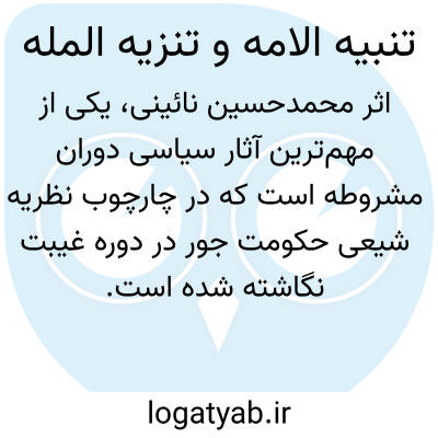 [ویکی فقه] تنبیه الامه و تنزیه المله (کتاب). تنبیه ُالاُمَّة و تَنْزیه ُالمِلَّة، مشهورترین رساله در باره مبانی فکری و ابعاد گوناگون حکومت مشروطه، بر اساس نگرش شیعی، نوشته میرزا محمدحسین غروی نائینی (متوفی ۱۳۵۵) و به زبان فارسی است.