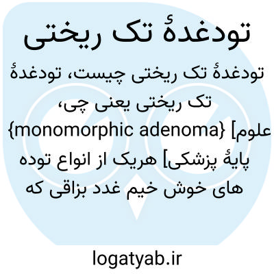 {monomorphic adenoma} [علوم پایۀ پزشکی] هریک از انواع توده های خوش خیم غدد بزاقی که بافت پیوندی آنها تغییر نمی کند و عموماً از یک نوع یاخته تشکیل شده اند