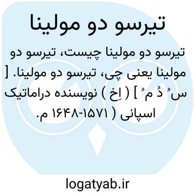 تیرسو دو مولینا. [ س ُ دُ م ُ ] ( اِخ ) نویسنده دراماتیک اسپانی ( 1571-1648 م. ) است. وی در میلان متولد شد و آثار کمدی فراوانی از خود باقی گذاشت. از آن جمله: جاه طلب بزدل و شیاد اشبیلیه می باشند. ( از لاروس ). رجوع به قاموس الاعلام ترکی شود.