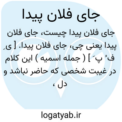 جای فلان پیدا. [ ی ِ ف ُ پ َ ] ( جمله اسمیه ) این کلام در غیبت شخصی که حاضر نباشد و دل، حاضر بودنش خواهد، گویند. ( بهارعجم ) ( آنندراج ). برای کسی گویند که غایب باشد. ( ناظم الاطباء ). جای فلان خالی. جای فلان سبز. ( بهار عجم ) ( آنندراج ) ( ناظم الاطباء ). و برای تیمن بیشتر جای فلان پیدا مستعمل است. ( بهار عجم ) ( آنندراج ):