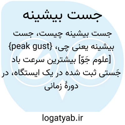 {peak gust} [علوم جَوّ] بیشترین سرعت باد جَستی ثبت شده در یک ایستگاه، در دورۀ زمانی معین، معمولاً بیست وچهار ساعت