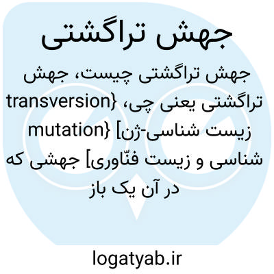 {transversion mutation} [زیست شناسی-ژن شناسی و زیست فنّاوری] جهشی که در آن یک باز پورین جانشین یک باز پیریمیدین میشود یا برعکس متـ. تراگشت transversion