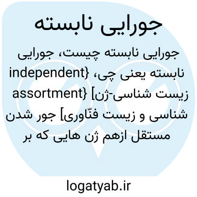 {independent assortment} [زیست شناسی-ژن شناسی و زیست فنّاوری] جور شدن مستقل ازهم ژن هایی که بر روی فام تن های دگرساخت قرار دارند