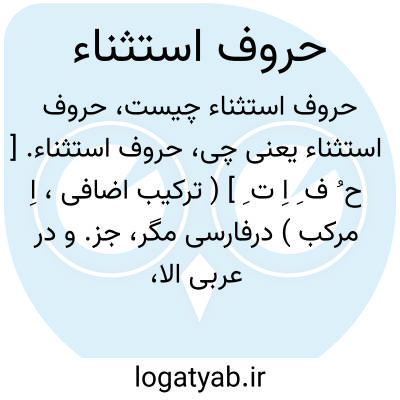 حروف استثناء. [ ح ُ ف ِ اِ ت ِ ] ( ترکیب اضافی، اِ مرکب ) درفارسی مگر، جز. و در عربی الا، لکن، بل، آمده است.