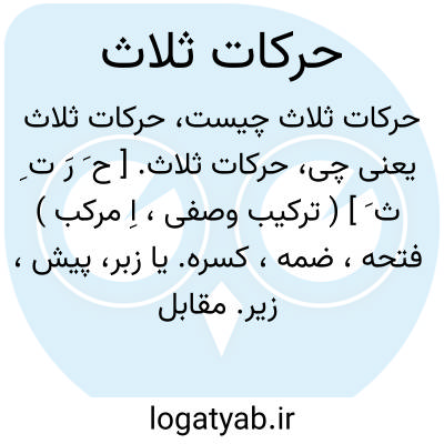حرکات ثلاث. [ ح َ رَ ت ِ ث َ ] ( ترکیب وصفی، اِ مرکب ) فتحه، ضمه، کسره. یا زبر، پیش، زیر. مقابل سکون و جزم. حروف مصوته. رجوع به حرف مصوت و فتحه و زبر وکسره و زیر و ضمه و پیش و نیز رجوع به اعراب شود.