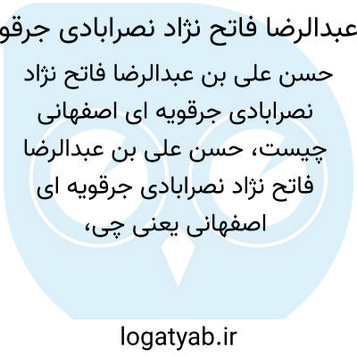 [ویکی فقه] حسن علی بن عبدالرضا فاتح نژاد نصرآبادی جرقویه ای اصفهانی. حسن علی بن عبدالرضا فاتح نژاد نصرآبادی جرقویه ای اصفهانی، از پزشکان ماهر عصر حاضر در اصفهان می باشد.