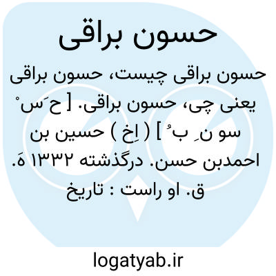 حسون براقی. [ ح َس ْ سو ن ِ ب ُ ] ( اِخ ) حسین بن احمدبن حسن. درگذشته 1332 هَ. ق. او راست: تاریخ کوفة که در 1357هَ. ق. در نجف به تصحیح محمد صادق بحرالعلوم و مقدمه محمد رضا شبیبی چاپ شده است. و کتب دیگر او در ذریعه ج 3 ص 78، 138، 151، 164، 250، 280، 282، 285، 286، 290، و ج 4 ص 166، 212، و ج 5 ص 124 و 293 و ج 7 ص 14 وج 8 ص 91، 104 و ج 10 ص 112 و ج 11 ص 56، 104 آمده است.