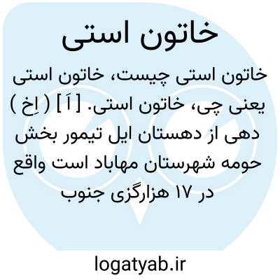 خاتون استی. [ اَ ] ( اِخ ) دهی از دهستان ایل تیمور بخش حومه شهرستان مهاباد است واقع در 17 هزارگزی جنوب مهاباد و 2 هزارگزی باختر شوسه مهاباد بسر دشت. محلی است کوهستانی با هوای معتدل و سالم. سکنه آن 91 تن. مذهبشان سنی و زبانشان کردی است. آب آن از چشمه و محصولات آن غلات و توتون و حبوبات است. شغل اهالی زراعت و گله داری میباشدراه آنجا مالرو است. ( فرهنگ جغرافیائی ایران ج 4 ).