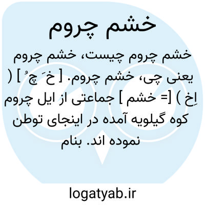 خشم چروم. [ خ َ چ ُ ] ( اِخ ) [= خشم ] جماعتی از ایل چروم کوه گیلویه آمده در اینجای توطن نموده اند. بنام آنها مشهور گردید دو فرسنگ کمتر میانه شمال و مشرق خشت. اصل خشم حشم بحاء بی نقطه است که ایل و طایفه باشد. ( فارسنامه ابن بلخی ).