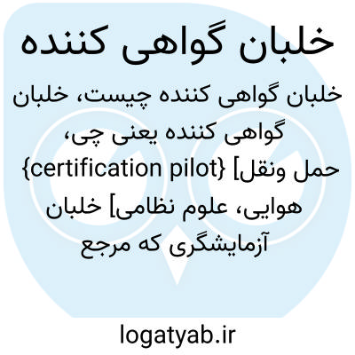 {certification pilot} [حمل ونقل هوایی، علوم نظامی] خلبان آزمایشگری که مرجع ملی صدور گواهی، او را برای ارزیابی انواع هواگردهای مورداستفادۀ کاروَرها در کشوری خاص به خدمت می گیرد