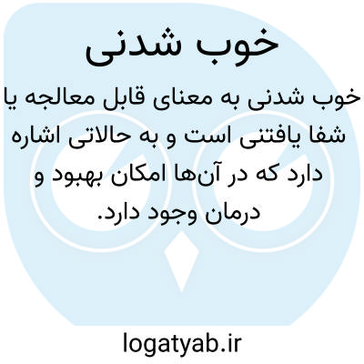 خوب شدنی به معنای قابل معالجه یا شفا یافتنی است و به حالاتی اشاره دارد که در آن‌ها امکان بهبود و درمان وجود دارد. این واژه به طور خاص در زمینه‌های پزشکی و درمانی به کار می‌رود و به وضعیت‌هایی اشاره دارد که می‌توانند با درمان مناسب بهبود یابند. به عبارت دیگر، خوب شدنی نشان‌دهنده این است که یک مشکل یا بیماری می‌تواند به کمک روش‌های درمانی به حالت بهتری تغییر کند.