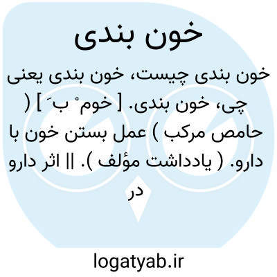 خون بندی. [ خوم ْ ب َ ] ( حامص مرکب ) عمل بستن خون با دارو. ( یادداشت مؤلف ). || اثر دارو در بستن خون. ( یادداشت مؤلف ).