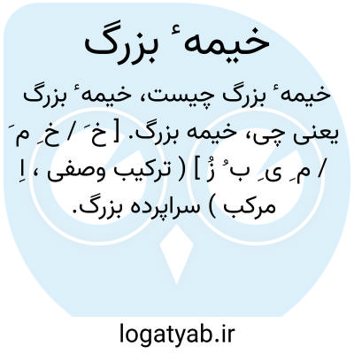 خیمه بزرگ. [ خ َ / خ ِ م َ / م ِ ی ِ ب ُ زُ ] ( ترکیب وصفی، اِ مرکب ) سراپرده بزرگ. سراپرده شاهان. فسطاط: خیمه و خرگاه و سراپرده بزرگ زده او را از پیل گرفتند. ( تاریخ بیهقی ). خوارزمشاه موزه و کلاه پوشید و بخیمه بزرگ آمد. ( تاریخ بیهقی ). خیمه بزرگ بر بالا برده بودند از شهر برسم... و بلند و همه سوادسازی زیر آن. ( تاریخ بیهقی ).