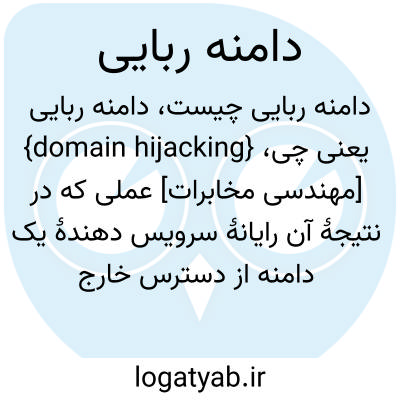 {domain hijacking} [مهندسی مخابرات] عملی که در نتیجۀ آن رایانۀ سرویس دهندۀ یک دامنه از دسترس خارج می شود و سرویس دهندۀ متعلق به مهاجم، جای سرویس دهندۀ اصلی را می گیرد
