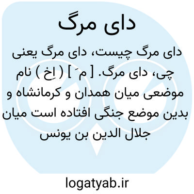 دای مرگ. [ م َ ] ( اِخ ) نام موضعی میان همدان و کرمانشاه و بدین موضع جنگی افتاده است میان جلال الدین بن یونس وزیر الناصرلدین الله خلیفه عباسی و سلطان طغرل سلجوقی در 583 هَ. ق. ( از اخبارالدولة السلجوقیة ص 177 ). و نیز رجوع به دای مرج شود.
