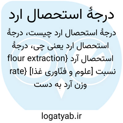درجۀ استحصال آرد {flour extraction rate} [علوم و فنّاوری غذا] نسبت وزن آرد به دست آمده نسبت به وزن کل گندم به درصد