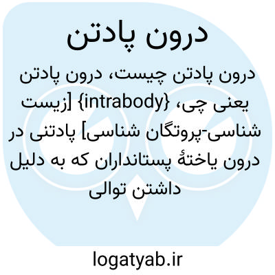 {intrabody} [زیست شناسی-پروتگان شناسی] پادتنی در درون یاختۀ پستانداران که به دلیل داشتن توالی پیام رسان خاص به جایگاه های ویژۀ درون یاخته ای هدایت شود