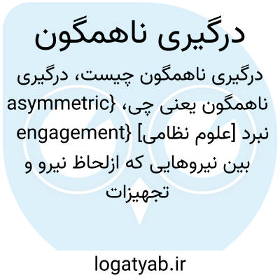 {asymmetric engagement} [علوم نظامی] نبرد بین نیروهایی که ازلحاظ نیرو و تجهیزات توانمندی های یکسانی ندارند