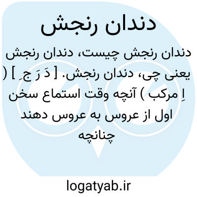 دندان رنجش. [ دَ رَ ج ِ ] ( اِ مرکب ) آنچه وقت استماع سخن اول از عروس به عروس دهند چنانچه رونما وقت دیدن روی به او دهند، و این از اهل زبان به تحقیق پیوسته. ( آنندراج ):