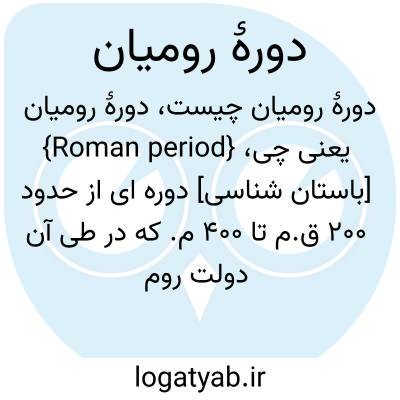 {Roman period} [باستان شناسی] دوره ای از حدود 200 ق.م تا 400 م. که در طی آن دولت روم بر مناطق مختلفی در اروپا و آسیا و افریقا سلطۀ سیاسی و نظامی داشت