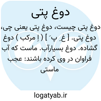 دوغ پتی. [ غ ِ پ َ ] ( اِ مرکب ) دوغ گشاده. دوغ بسیارآب. ماست که آب فراوان در وی کرده باشند: عجب ماستی خریدیم که همه اش دوغ پتی بود. ( یادداشت مؤلف ).