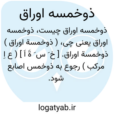 ( ذوخمسة اوراق ) ذوخمسة اوراق. [ خ َ س َ ةَ اَ ] ( ع اِ مرکب ) رجوع به ذوخمس اصابع شود. و صاحب اختیارات گوید: ذوخمسة اوراق و ذوخمسة اصابع فنجنکشت است و صاحب جامع سهو کرده است که میگوید فنطافلون غیر پنجنگشت است و در این باب قول صاحب منهاج معتبر است ذوخمسة اقسام و ذوخمسة اجنحة نیز گویند در صفت پنجگشت گفته شد و در باب الف در صفت اثلق و چند اسم دیگر که دارد هم گفته شود. رجوع به ذوخمسة اصابع شود.