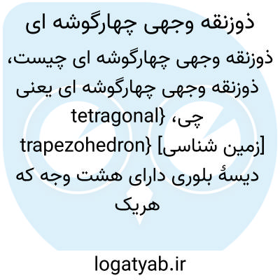 {tetragonal trapezohedron} [زمین شناسی] دیسۀ بلوری دارای هشت وجه که هریک از آنها یک ذوزنقه است متـ. ذوزنقه وجهی چهارگوش