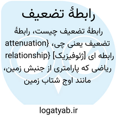 {attenuation relationship} [ژئوفیزیک] رابطه ای ریاضی که پارامتری از جنبش زمین، مانند اوج شتاب زمین را به پارامترهای چشمه و مسیر انتشار موج های زمین لرزه نسبت می دهد