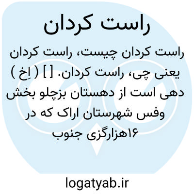 راست کردان. [ ] ( اِخ ) دهی است از دهستان بزچلو بخش وفس شهرستان اراک که در 16هزارگزی جنوب خاوری کمیجان واقع است. محلی است کوهستانی، سردسیر، و سکنه آن 161 تن است. آب آن از قنات تأمین میشود و محصول آن غلات دیمی، انگور، لبنیات، و شغل اهالی زراعت و گله داری و قالیبافی است. راه آن مالرو است. ( از فرهنگ جغرافیایی ایران ج 2 ).