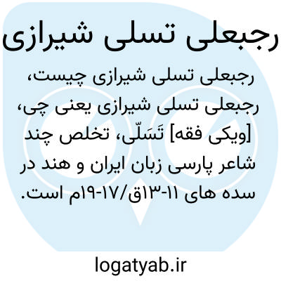 [ویکی فقه] تَسَلّی، تخلص چند شاعر پارسی زبان ایران و هند در سده های ۱۱-۱۳ق/۱۷-۱۹م است. رجبعلی تسلی شیرازی یکی از شعرایی است که به تسلی تخلص یافته است.