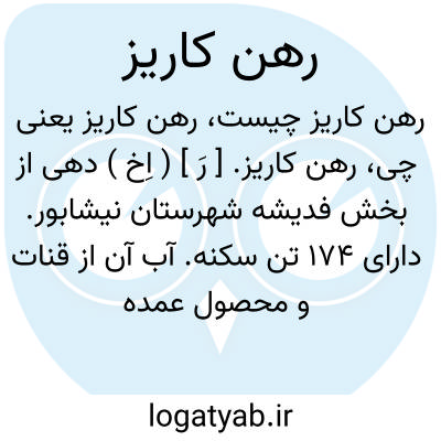 رهن کاریز. [ رَ ] ( اِخ ) دهی از بخش فدیشه شهرستان نیشابور. دارای 174 تن سکنه. آب آن از قنات و محصول عمده آنجا غلات و راهش اتومبیل رو می باشد. ( از فرهنگ جغرافیایی ایران ج 9 ).
