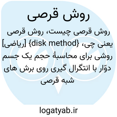 {disk method} [ریاضی] روشی برای محاسبۀ حجم یک جسم دوّار با انتگرال گیری روی برش های شبه قرصی بی نهایت کوچک که محدود به صفحه های عمود بر محور دوران باشند