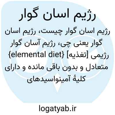 {elemental diet} [تغذیه] رژیمی متعادل و بدون باقی مانده و دارای کلیۀ آمینواسیدهای ضروری و غیرضروری ترکیب شده با قندهای ساده و املاح و ویتامین ها و برق کاف ها