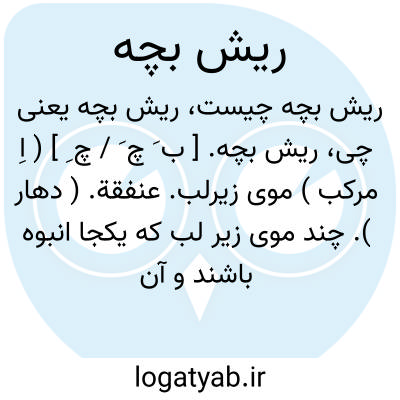 ریش بچه. [ ب َ چ َ / چ ِ ] ( اِ مرکب ) موی زیرلب. عنفقة. ( دهار ). چند موی زیر لب که یکجا انبوه باشند و آن را به عربی عنفقة خوانند. ( آنندراج ) ( از منتهی الارب ). موی پاره ای میان لب زیرین و زنخ. ( یادداشت مؤلف ). || ریش کوچک. ( ناظم الاطباء ).