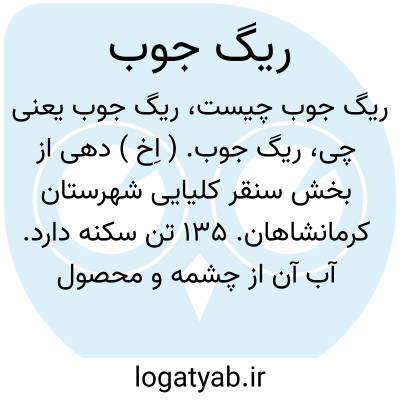 ریگ جوب. ( اِخ ) دهی از بخش سنقر کلیایی شهرستان کرمانشاهان. 135 تن سکنه دارد. آب آن از چشمه و محصول عمده آنجا غلات و توتون و حبوب و قلمستان و صنایع دستی زنان جاجیم و پلاس بافی است. ( از فرهنگ جغرافیایی ایران ج 5 ).