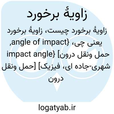 {angle of impact, impact angle} [حمل ونقل درون شهری-جاده ای، فیزیک] [حمل ونقل درون شهری-جاده ای] زاویۀ بین محور تقارن مانع طولی و مسیر حرکت خودرو در محل تصادف [فیزیک] زاویۀ تند پرتابه با افق، در هنگام برخورد آن با زمین