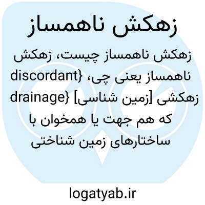 {discordant drainage} [زمین شناسی] زهکشی که هم جهت یا همخوان با ساختارهای زمین شناختی موجود شکل نگرفته باشد