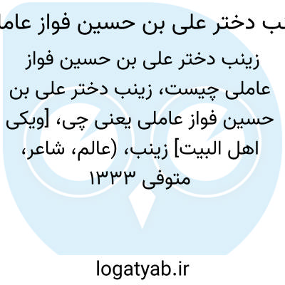 [ویکی اهل البیت] زینب، (عالم، شاعر، متوفی 1333 هـ.ق) دختر علی بن حسین فواز عاملی، بانویی دانشمند شاعر و عالم در نحو و صرف و معانی و بیان و اوزان مختلف شعر و سبک های آن و تاریخ و انشاء و قرائت و کتابت بود.