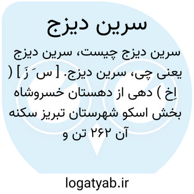 سرین دیزج. [ س َ زَ ] ( اِخ ) دهی از دهستان خسروشاه بخش اسکو شهرستان تبریز سکنه آن 262 تن و آب آن از چشمه و تلخه رود و محصول آن غلات و شغل اهالی زراعت و گله داری است. ( از فرهنگ جغرافیایی ایران ج 4 ).