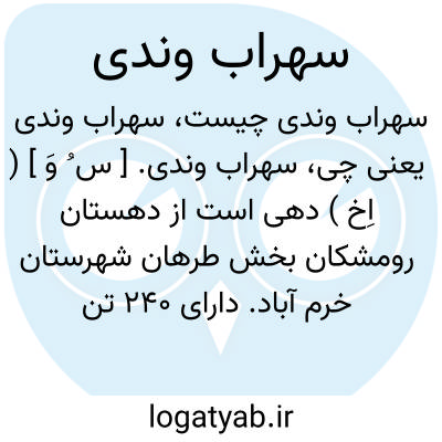سهراب وندی. [ س ُ وَ ] ( اِخ ) دهی است از دهستان رومشکان بخش طرهان شهرستان خرم آباد. دارای 240 تن سکنه. آب آن از چاه. محصول آنجا غلات، لبنیات، پشم.ساکنین از طایفه امرائی بوده و در ساختمان و سیاه چادر سکونت دارند. ( از فرهنگ جغرافیائی ایران ج 6 ).