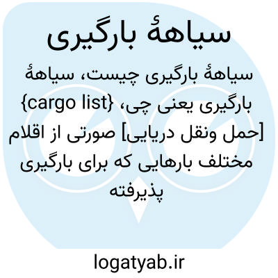 {cargo list} [حمل ونقل دریایی] صورتی از اقلام مختلف بارهایی که برای بارگیری پذیرفته شده اند و از آن برای تنظیم نقشۀ بارگیری در کشتی استفاده می کنند