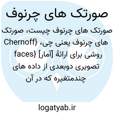 {Chernoff faces} [آمار] روشی برای ارائۀ تصویری دوبعدی از داده های چندمتغیره که در آن شکل و اندازه و اجزای مختلف یک چهره، براساس مقدار متغیرهای متناظر، تغییر می کند