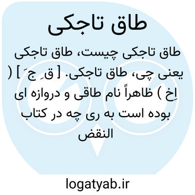 طاق تاجکی. [ ق ِ ج َ ] ( اِخ ) ظاهراً نام طاقی و دروازه ای بوده است به ری چه در کتاب النقض آمده است: و در شهر ری خادم و ابوالقاسم عبودیه و ابوالقاسم شوّاء و غیرهم که امیر قجقرشان بطاق تاجکی برآویخت همه رافضی بودند. ( النقض ص 85 ) و در ص 89 همان کتاب آمده است: و امیر قجقر بفرمود تا بتدارک آن انبان فروش خارجی که قصد ابوالقاسم عبدویه کرده بود از طاق تاجکی درآویختند.