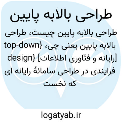 {top-down design} [رایانه و فنّاوری اطلاعات] فرایندی در طراحی سامانۀ رایانه ای که نخست مؤلفه های اصلی را شناسایی و سپس آنها را مرحله به مرحله آن قدر تجزیه می کند تا میزان مناسبی از جزئیات مؤلفه ای حاصل شود