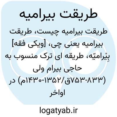 [ویکی فقه] بِیْرامیّه، طریقه ای ترک منسوب به حاجی بیرام ولی (۷۵۳-۸۳۳ق/۱۳۵۲-۱۴۳۰م) در اواخر قرن هشتم و نیمه اول قرن نهم در آنقره (آنکارا) که در آناتولی و سرزمین های بالکان پیروان بسیار داشت.