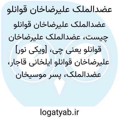 [ویکی نور] علیرضاخان قوانلو ایلخانی قاجار، عضدالملک، پسر موسیخان و دایی زاده ناصرالدین شاه قاجار در سال 1238ق. در تهران متولد شد. در زمان سلطنت محمدشاه، سالهای اول سلطنت ناصرالدین شاه، غلام بچه ای بیش نبود و در سال 1271ق. پیشخدمت خاصه شاه گردید. در سال 1285ق. پس از درگذشت میرزا محمدحسین قزوینی، ملقب به عضدالملک و در همین سال مهردار شاه نیز شد.