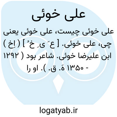 علی خوئی. [ ع َ ی ِ خ ُ ] ( اِخ ) ابن علیرضا خوئی. شاعر بود ( 1292 - 1350 هَ. ق. ). او را دیوان شعری است محتوی بر اشعار عربی و فارسی. ( از الذریعه آقابزرگ طهرانی ج 9 ص 745 بنقل از الحدیقة المبهجه اردوبادی ).