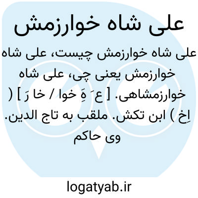علی شاه خوارزمشاهی. [ ع َ هَِ خوا / خا رَ ] ( اِخ ) ابن تکش. ملقب به تاج الدین. وی حاکم نیشابور بود و در سال 597 هَ. ق. سلطان غیاث الدین محمد غوری لشکر به شادیاخ نیشابور کشید و پس از مدتی محاصره توانست آنجا را تسخیر کند و علیشاه بن تکش را دست بسته نزد او آوردند ولی به اشاره دایه سلطان او را رها کردند و بخوارزم فرستادند. بعدها وقتی سلطان غیاث الدین محمود بسلطنت رسید علیشاه بن تکش از نزد برادرخود سلطان محمد خوارزمشاه فرار کرد و به فیروزکوه غور نزد سلطان محمود رفت و چون سلطان محمد، علیشاه رااز سلطان محمود مطالبه کرد او را دست بند زدند تا نزد برادرش بازگردانند. اما عده ای از اهل عراق و خراسان که از طرفداران علیشاه بودند از سلطان محمود خواستند که از این امر منصرف شود و سلطان محمود چون تقاضای آنها را نپذیرفت وی را کشتند و بهاءالدین سام بتخت سلطنت نشست. و پس از این واقعه علیشاه به طرف غزنین رفت. ( از حبیب السیر چ خیام ج 2 ص 606 و 608 ). و رجوع به تاریخ مفصل ایران، مغول، عباس اقبال ص 10 شود.